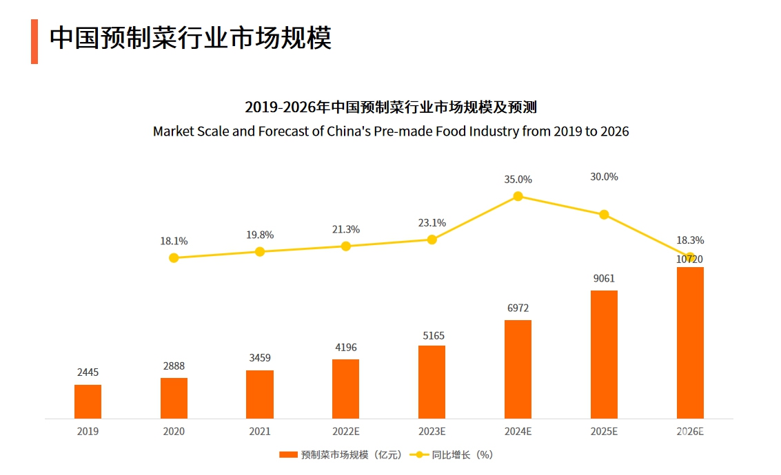 2026年預制菜市場規模將達10720億元。預制菜有效地降低了餐廳運營成本,且緩解了疫情期間堂食減少的損失,吸引了各大連鎖餐飲品牌入行布局。